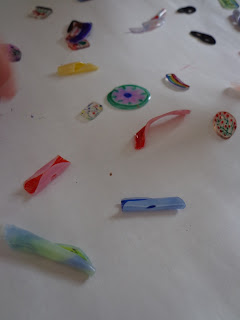 We also tried using plastic cups that were a translucent white and #6. That had various results. The round flower above was from the bottom of the cup and worked pretty well. Some of the sides of the cup kind of worked too (they didn't shrink in a consistent manor though) and a lot of the ones from the side simply curled up. We think there is potential to use them in other ways.