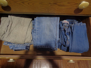I am curious how things go in your family when you are going through your children's clothes. We get most of clothes second hand and a lot of Megan's especially are given to us. She has always had plenty of clothes as a result but not always ones she likes a lot. But I have been quite guilty over the years of making her keep a bunch that she never wants to wear. "That would look so cute on you." "You might want that sometime." "You might need that." As a result Megan has generally always had a stuffed dresser and full closet but complains about not having clothes to wear or things she likes. She also has really struggled at times to keep things clean. She shoves things in her drawers and the drawers usually look quite chaotic. Like this:Today I determined to not make Megan keep things just because I wanted them for her. Yes we wanted her to have enough clothes to wear but currently she had way more than she needed and we had plenty of room for decluttering.